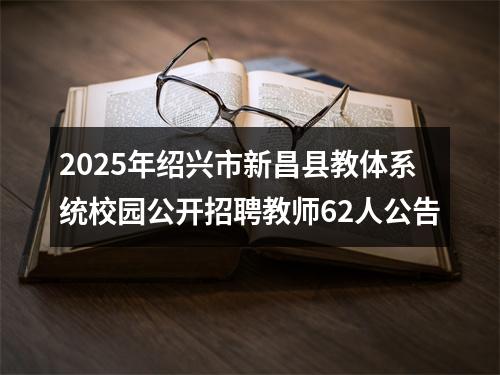 2025年教体系统计划校园公开招聘中小学教师62名(不包括新昌中学、澄潭中学招聘计划)。具体招聘学校、岗位、人数、学历和专业要求等详见《2025年新昌县教体系统校园公开招聘教师计划表》。考生可登录新昌县政府门户网站 (http://www.zjxc.gov.cn/)“招考录用”栏查询。